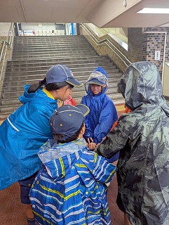 雨が降り続けるため、神社から離れて屋根のある公園まで移動後、ジャンケンゲームをしてから帰着。