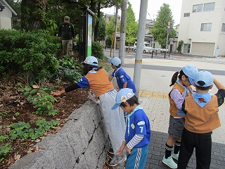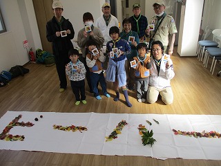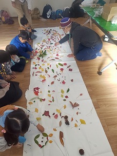 にします。公園を一周し、葉っぱを集め、かいかんで落ち葉アートに挑みます。みん