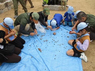 今年度最後の隊行事「オワカレ―ハイク」でフィナーレとなります。午後からの雨という天気予報なので、何事も素早く動くということで、選抜野球のリハーサル中の甲子園球場を横目に見て、九時半過ぎには甲子園海浜公園に到着。すぐに自然センターで鳥の観察や、実際にカニや貝に触ったりしました。それから浜に出て貝拾いや砂遊びをしました。そうこうしてるうち、食当さんが準備してくれている恒例「オワカレ―」ができあがっていきます。雨がぽつんと来ましたが、ビッグビーバーにとっては最後のビーバー隊昼食をあじわいました。辛口、甘口と二つの大鍋にいっぱいのカレーでお代わり自由。みんなおなかいっぱいになりました。そしてお別れの記念品贈呈、記念写真、全員写真を終え、雨が本格的に降る中を元気よく歩いて帰りました。