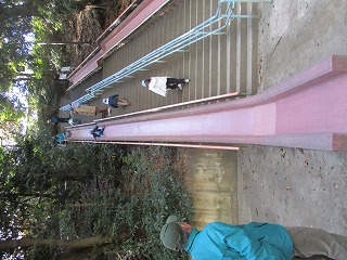 今季一番の寒気襲来で新春ハイクはどうだろう?という心配の中、みんな元気に集合し、予定通り須磨離宮公園にいきました。山陰にあるので時折風は吹きますがさほど震え上がるような寒さではなく、十分にフィールドアスレチックをあのしみました。ただ、半分以上が工事中で遊べなかったのは残念でした。昼食後、輪投げを楽しみ、移動。いよいよ恐怖のロングスライダーに挑戦。けいけんしゃは2名だけであとは初体験。何回も何回も挑戦し、たのしんでいましたが、お尻はかなりあかくなっていたはずです。そのあとまたまたおやつ輪投げを楽しみ、離宮公園から須磨寺参拝です。本堂でおいのりをし、鐘撞堂で世界平和と健康を祈って鐘撞をしました。