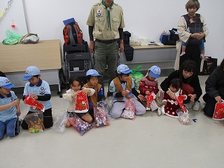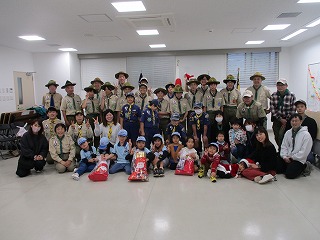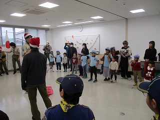 暖かく好天が続いていたのに、せっかくのユニセフ街頭募金があいにくの雨。それでも、BV,CSはJR尼崎駅で、BS・VSは杭瀬商店街で募金活動を行いました。ビーバーは大きな声で募金協力を呼びかけ、募金総額46642円のうち、28752円の協力をいただきました。昼食後は恒例クリスマス会、各隊出し物や映像による活動報告が行われ、クライマックスのキャンディ交換。50人近い人数と各隊隊長スペッシャルでいろいろなキャンディがクリスマスプレゼントとして交換されました。外は雨でしたが、ビーバーの下の弟や妹たちもたくさん参加してみんなで楽しく過ごした一日でした。