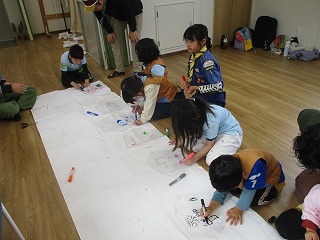 あいにくの雨、ですがちゃんと予想して三の坪会館を借りての凧つくり。グニャグニャ凧を作り、それぞれが絵を描いていきます。糸をつけ準備完了。幸い雨はやんでいましたが、風はもう一つ。それでもみんなは走り回り何とか揚げようとしていました。一時間ほどで午前の部は終了、昼食のおいしい豚汁を食べ、再度挑戦。今度は少し風がふいてくれ、隊長特製凧をはじめ、パパ凧も高く上がりました。会館に帰ってからは、ロールクイズの作成を楽しみ、BP祭の出し物練習をし、賞金1億円のじゃんけんお年玉をし、今日の集会を終えました。次回耐寒ハイクには凧持参で、淀川河畔で高く揚げます。